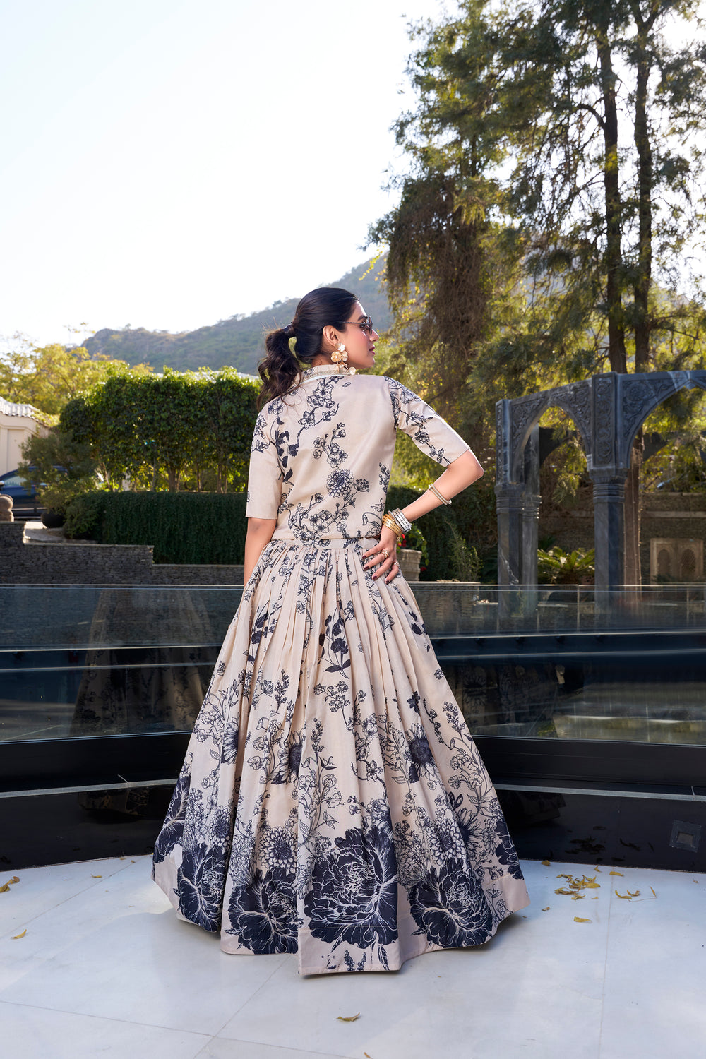 This premium cream tussar silk lehenga showcases elegant floral prints that create a sophisticated visual impact. The semi-stitched design features a generous 3.50-meter flair with canvas backing for structural integrity, while the fully stitched choli blouse completes this refined co-ord set. The natural sheen of tussar silk elevates this ensemble, making it an ideal choice for weddings, festivals, and formal celebrations where traditional elegance meets contemporary styling.