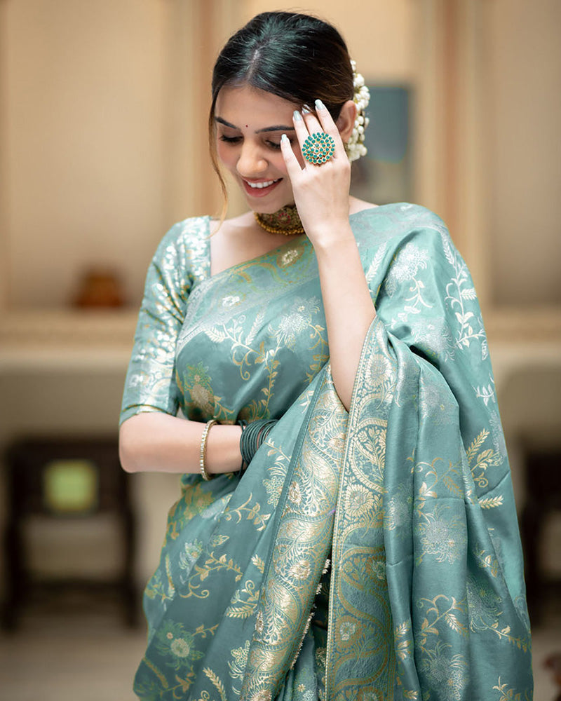 Celebrate timeless elegance with this Sky-colored Banarasi Jacquard saree, expertly crafted using fine zari weaving that highlights intricate patterns and a luxurious finish. Designed for weddings, festivals, and special occasions, this saree blends traditional charm with a contemporary appeal, making it an exceptional choice for discerning wardrobes. The rich sky hue enhances its graceful drape, ensuring you make a distinguished statement. Accompanied by an unstitched blouse piece, it affords you the flexibility to customize the fit perfectly to your preferences. This saree is both a versatile and exquisite addition to any collection.