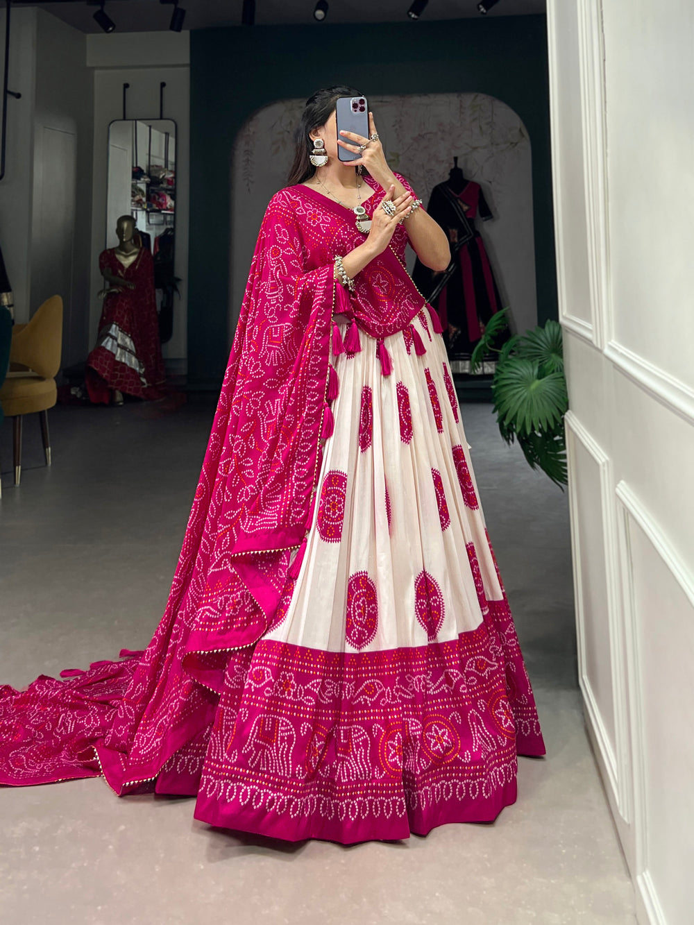 This exquisite pink lehenga choli crafted from high-quality Tussar silk features classic Bandhej prints. The lehenga is adorned with detailed craftsmanship that highlights cultural sophistication, and the unstitch blouse offers a tailored fit. Ideal for festive occasions, this outfit seamlessly combines traditional artistry with contemporary style.