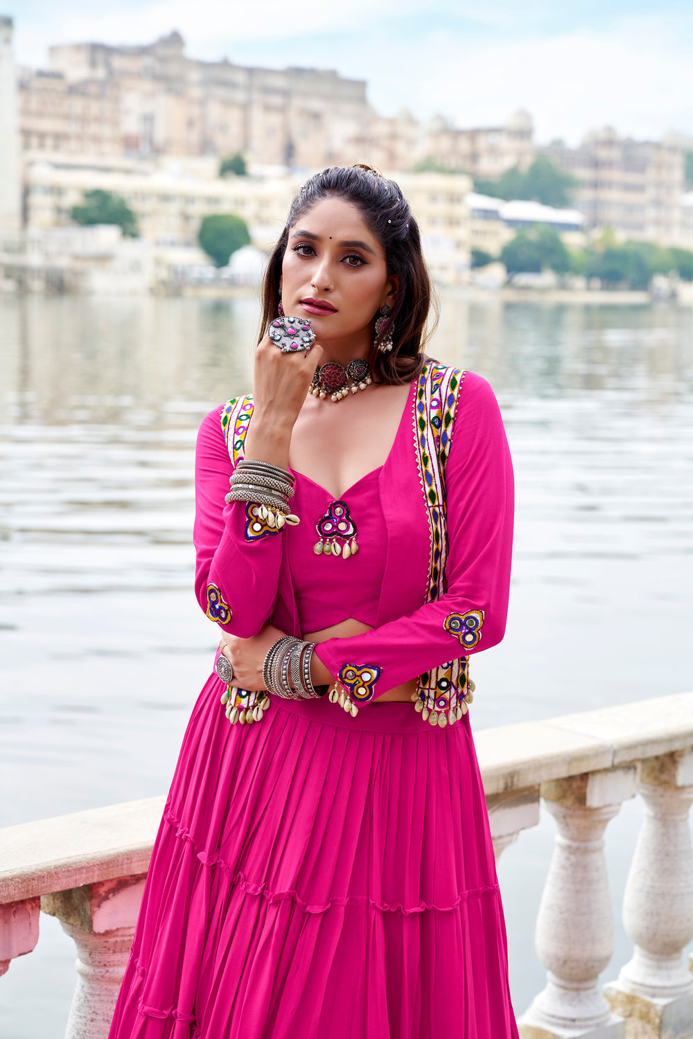Celebrate the festive spirit with this elegant pink pure rayon Navratri lehenga choli, designed to combine tradition and contemporary style effortlessly. The lightweight rayon fabric offers a soft, breathable feel, ensuring comfort throughout the day and night celebrations. Its graceful drape enhances your silhouette, while refined detailing adds a subtle touch of sophistication. Perfect for Navratri and other festive occasions, this lehenga choli promises both elegance and ease, helping you stand out with understated charm and vibrant color. Elevate your festive wardrobe with this carefully crafted ensemble that blends beauty and comfort seamlessly.