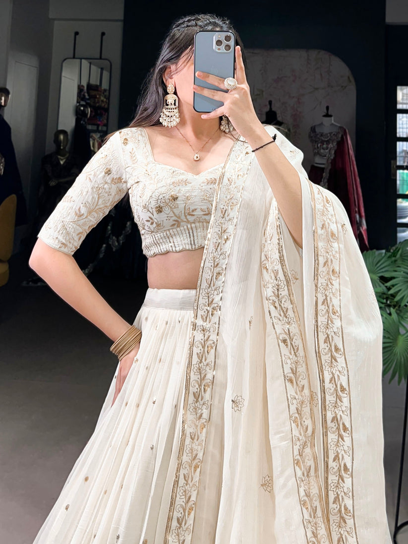 This enchanting off-white lehenga choli set is crafted from pure shimmer fabric, showcasing intricate weaving enhanced by delicate mirror and bead (moti) handwork. The stitched lehenga features a drawstring with zip closure, canvas with can-can for added volume, and a silk lining for all-day comfort. The unstitched blouse complements the ensemble with matching mirror detailing, while the dupatta is elegantly adorned with coordinated mirror and bead accents. Perfect for weddings and festive occasions, this designer set blends traditional artistry with sophisticated elegance.