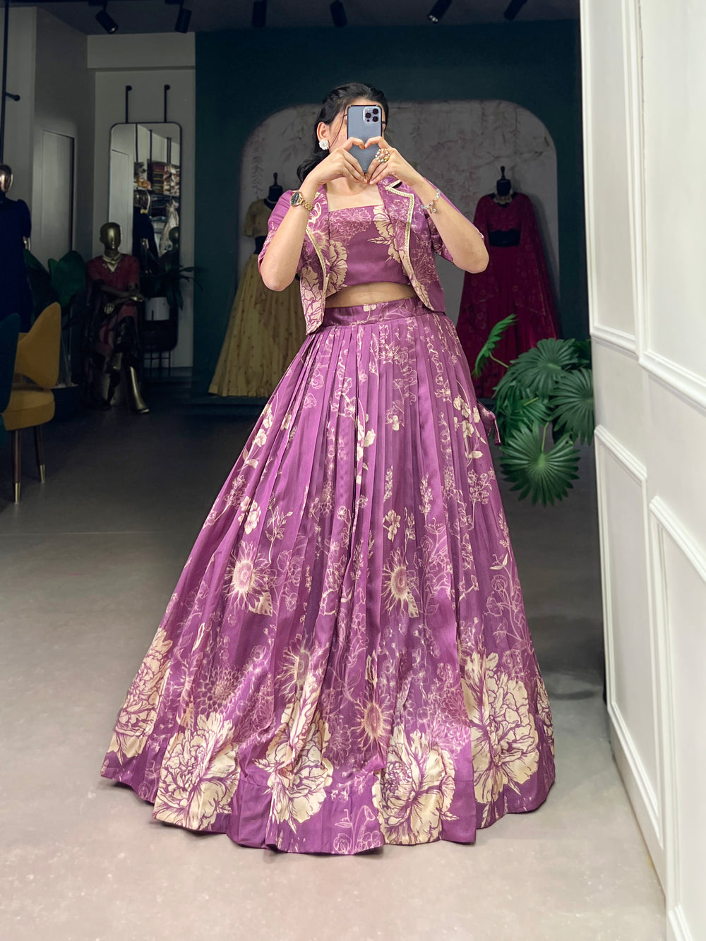 Step into elegance with this stunning 3-piece jacket style lehenga set, crafted for the modern woman who loves tradition with a twist. This ensemble features a beautifully tailored crop top blouse, paired with a voluminous floral printed lehenga skirt, and topped with a stylish open-front jacket for that extra layer of sophistication.