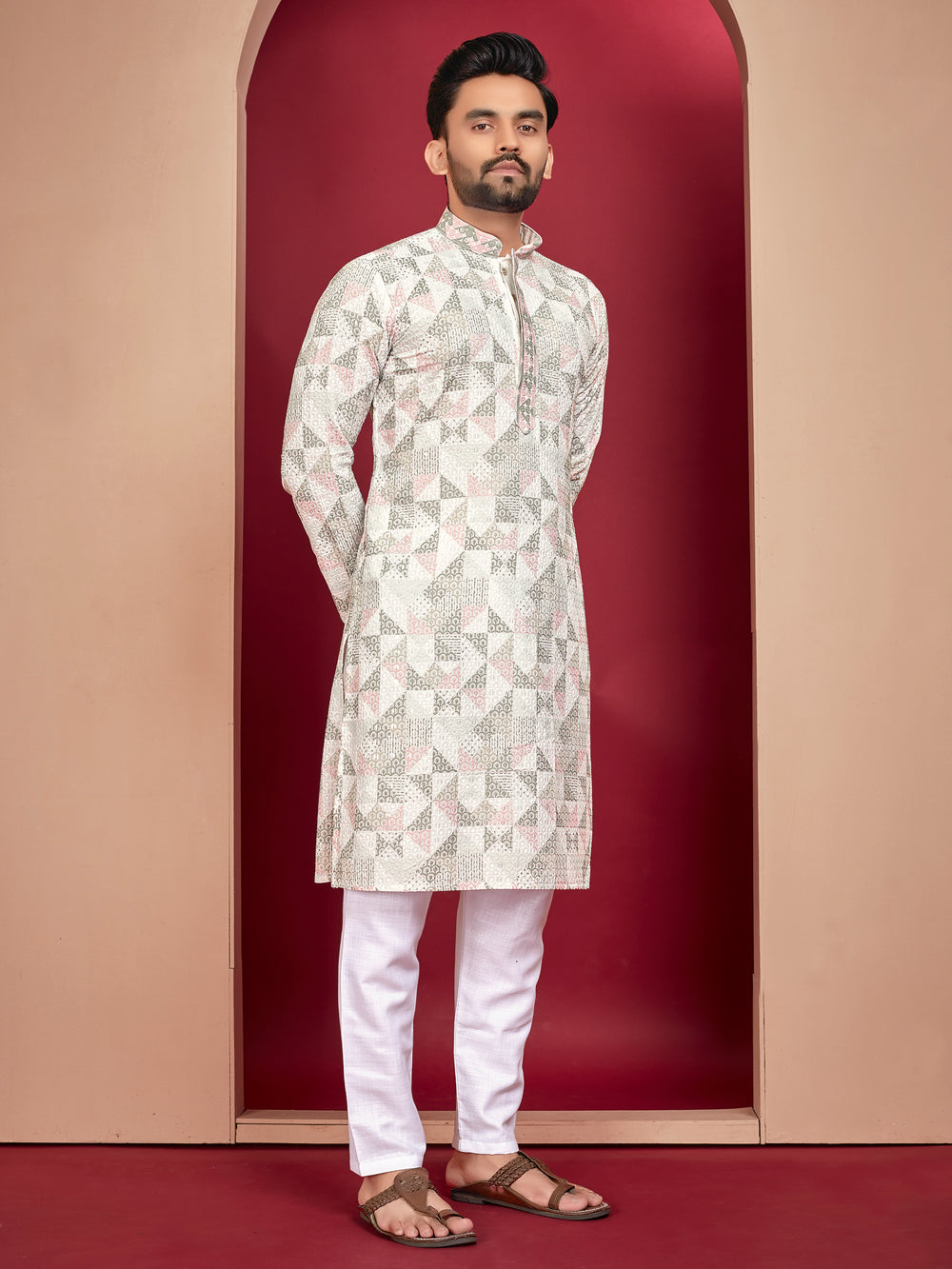 GREY WEDDING MENS KURTA PAJAMA IN RAYON WITH HEAVY LUCKNOWI AND PRINTED WORK