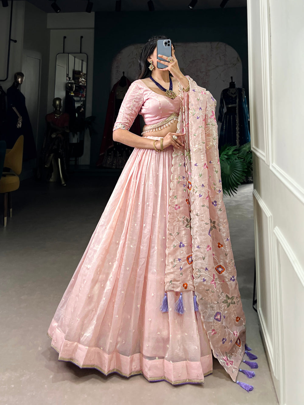 This light pink silk lehenga choli set features intricate thread embroidery and sequins on luxurious gold crush fabric, enhanced with delicate lace borders for a sophisticated finish. The unstitched blouse complements the lehenga with matching embroidery and lace accents, blending traditional craftsmanship with modern elegance. The coordinating gold crush dupatta, adorned with sequins, thread embroidery, and elegant tassels on both sides, completes the ensemble. Ideal for weddings and festive occasions, this set offers a regal and graceful look that elevates any ethnic wardrobe.