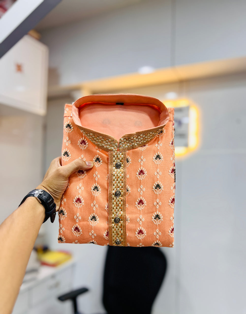 Elevate your wedding attire with our Peach Mens Kurta Pajama, featuring intricate Multi Embroidery Flower Work on lustrous Heavy J-card Silk. Complete the traditional look with the comfortable Cotton Pajama. Available in sizes M-3XL. Quality guaranteed with 100% Export Quality Products. Slight color variations may occur due to digital photography.