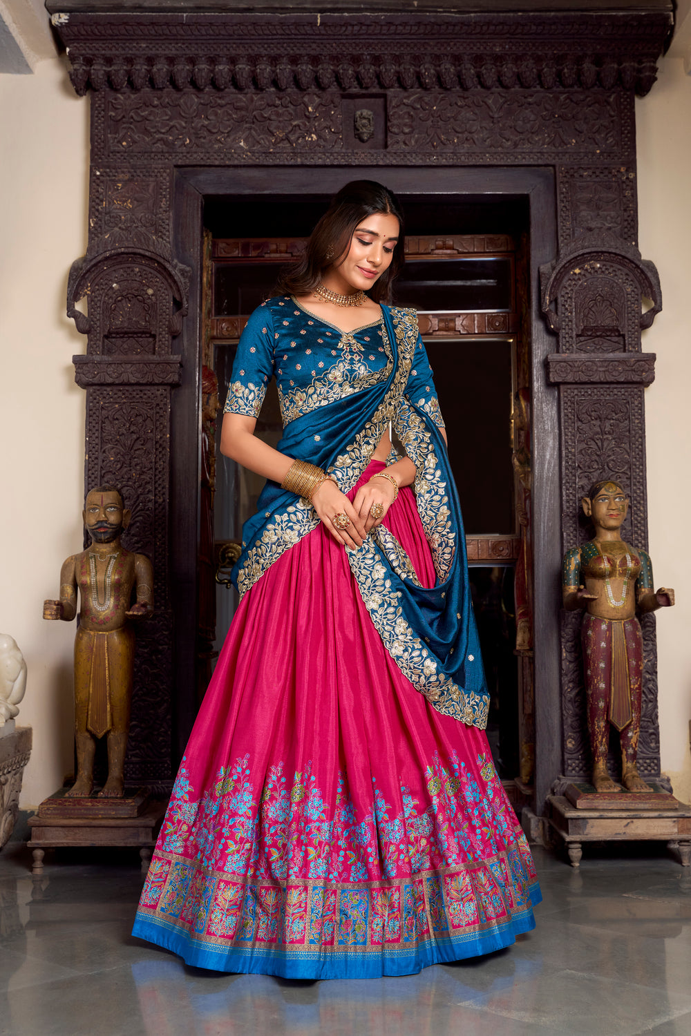 This pink Tussar silk lehenga choli embodies grace and elegance with its intricate prints and delicate foil work. The unstitched blouse offers the flexibility to tailor a personalized fit, ensuring both comfort and style. Perfectly suited for festive occasions, weddings, and traditional gatherings, this ensemble reflects refined craftsmanship and timeless appeal.
