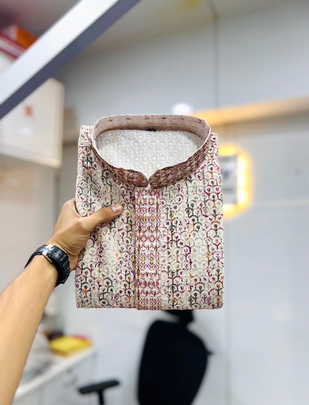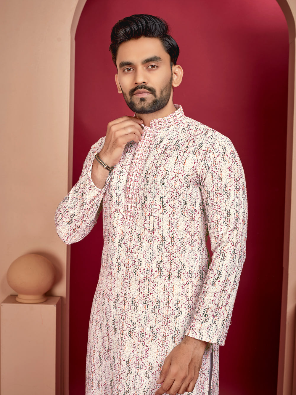 PINK WEDDING MENS KURTA PAJAMA IN RAYON WITH HEAVY LUCKNOWI AND PRINTED WORK