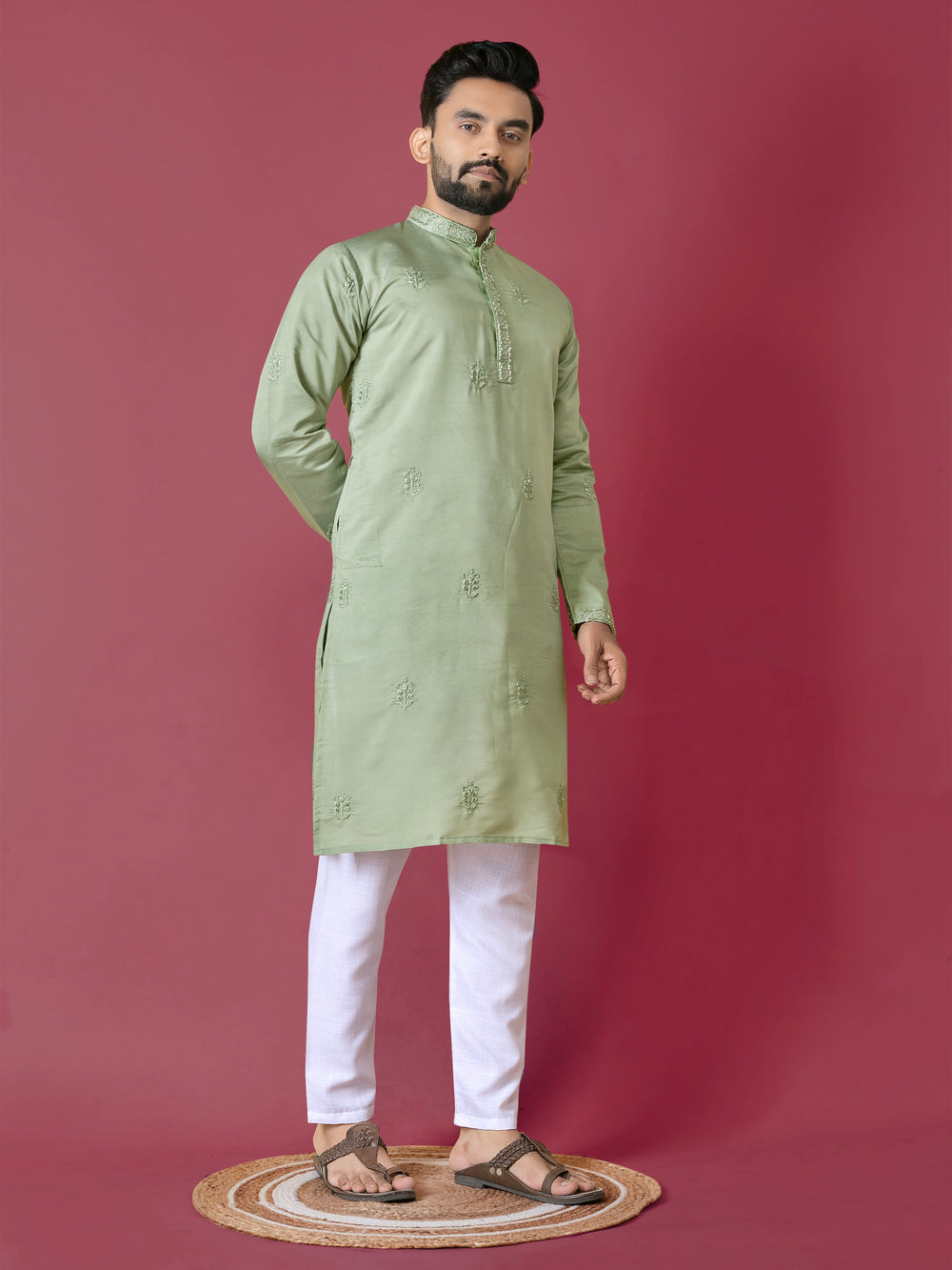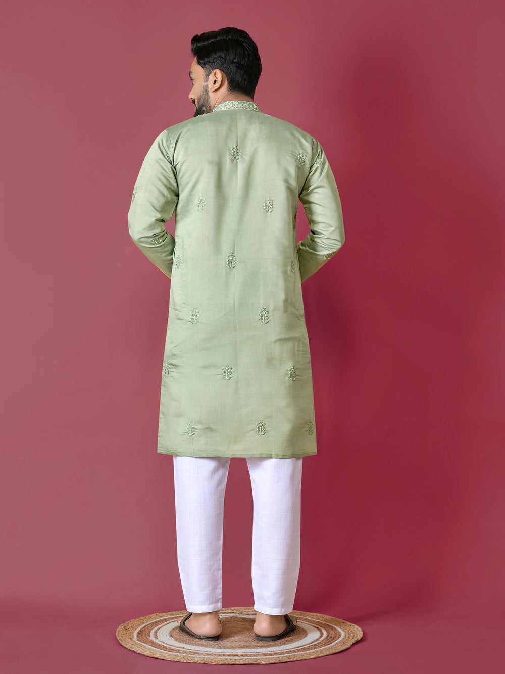 Pista Color Men's Kurta Pajama Set in Roman Silk With Val Moti Hand Work
