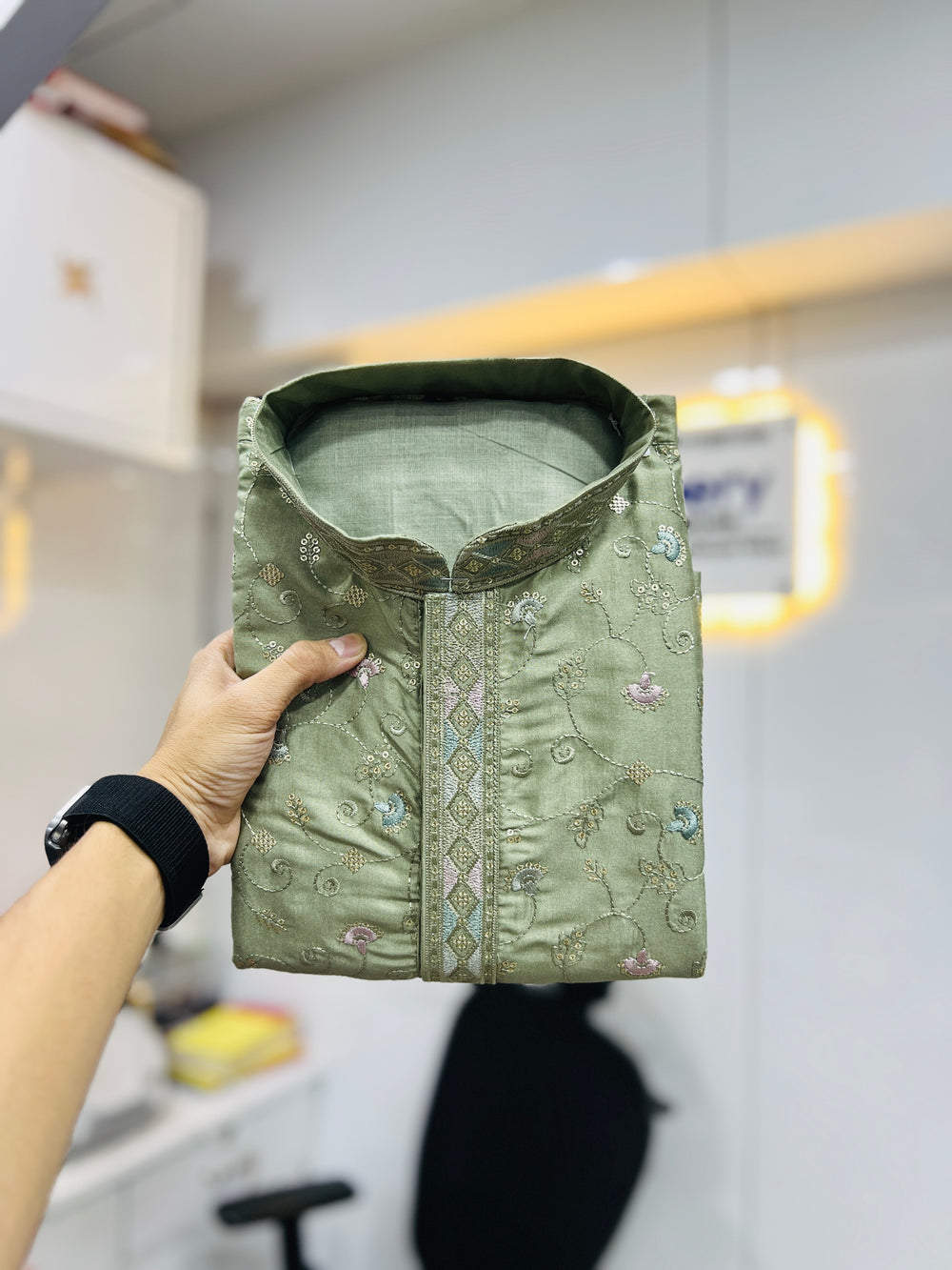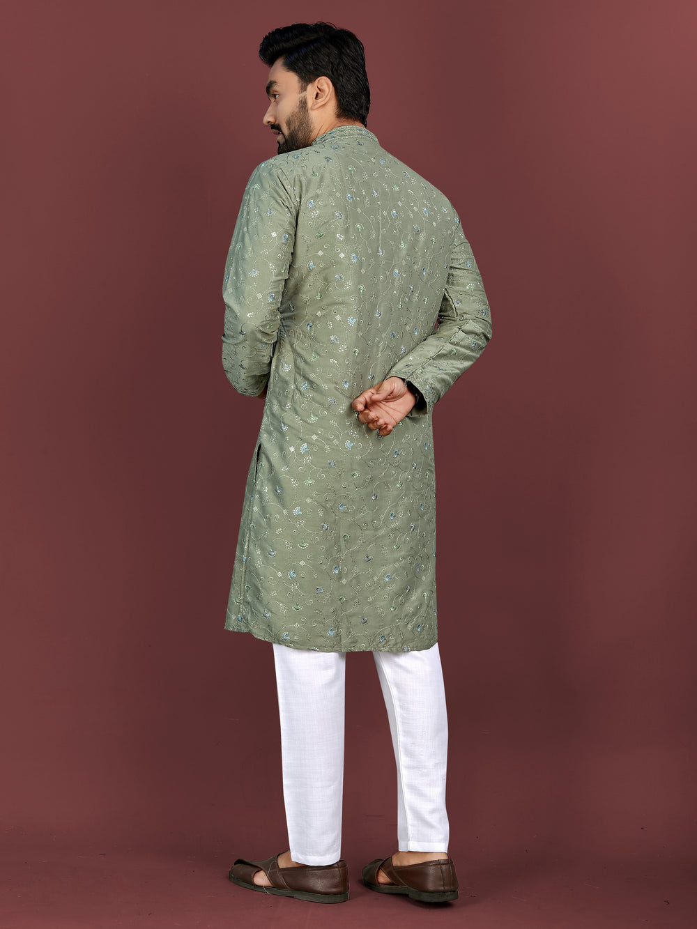 Elevate your wedding attire with our Pista Green Mens Kurta Pajama, featuring intricate Multi Embroidery Flower Work on lustrous Silky Silk fabric. Complete the traditional look with the comfortable Cotton Pajama. Available in sizes M-3XL. Quality guaranteed with 100% Export Quality Products. Slight color variations may occur due to digital photography.