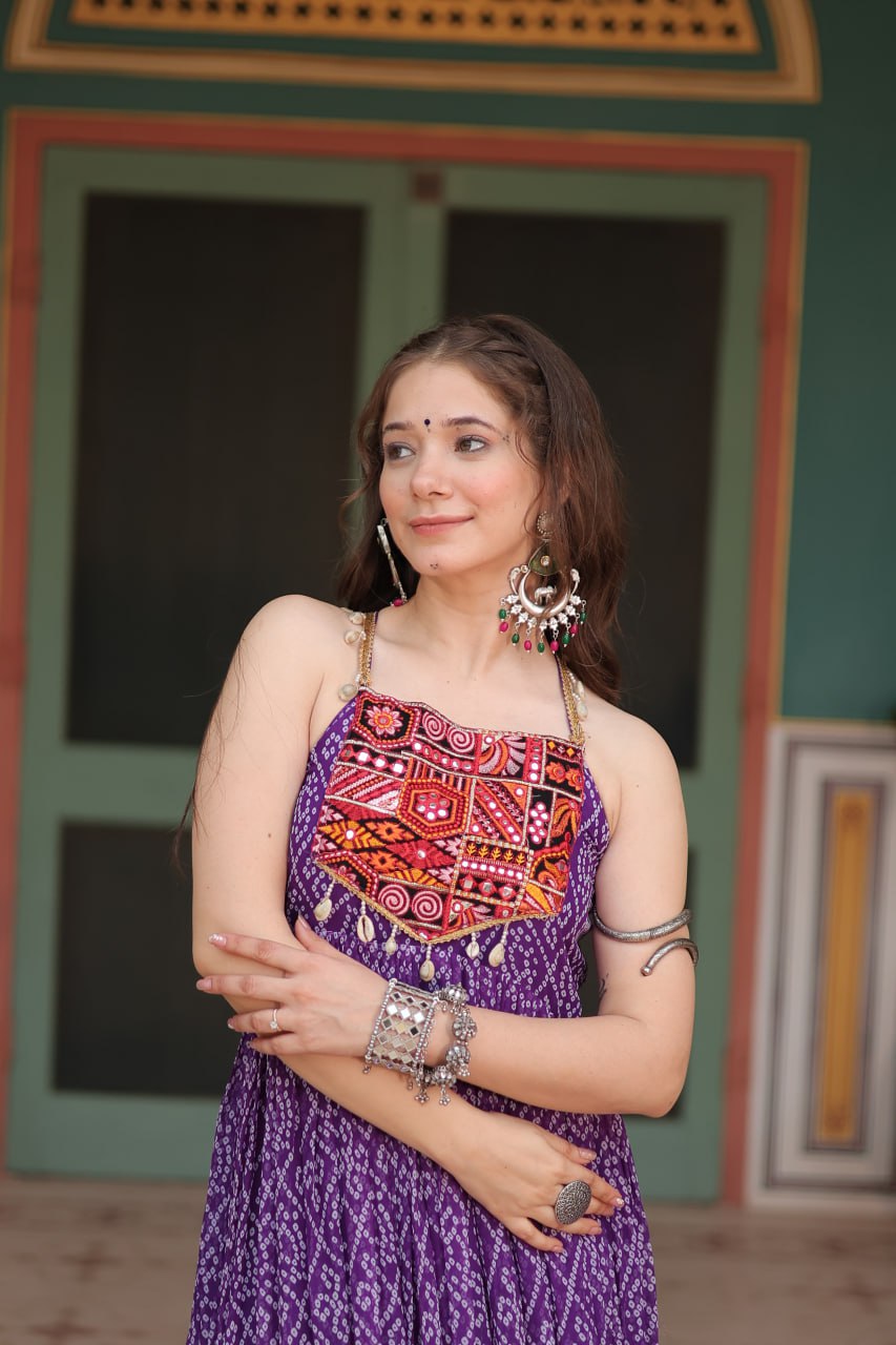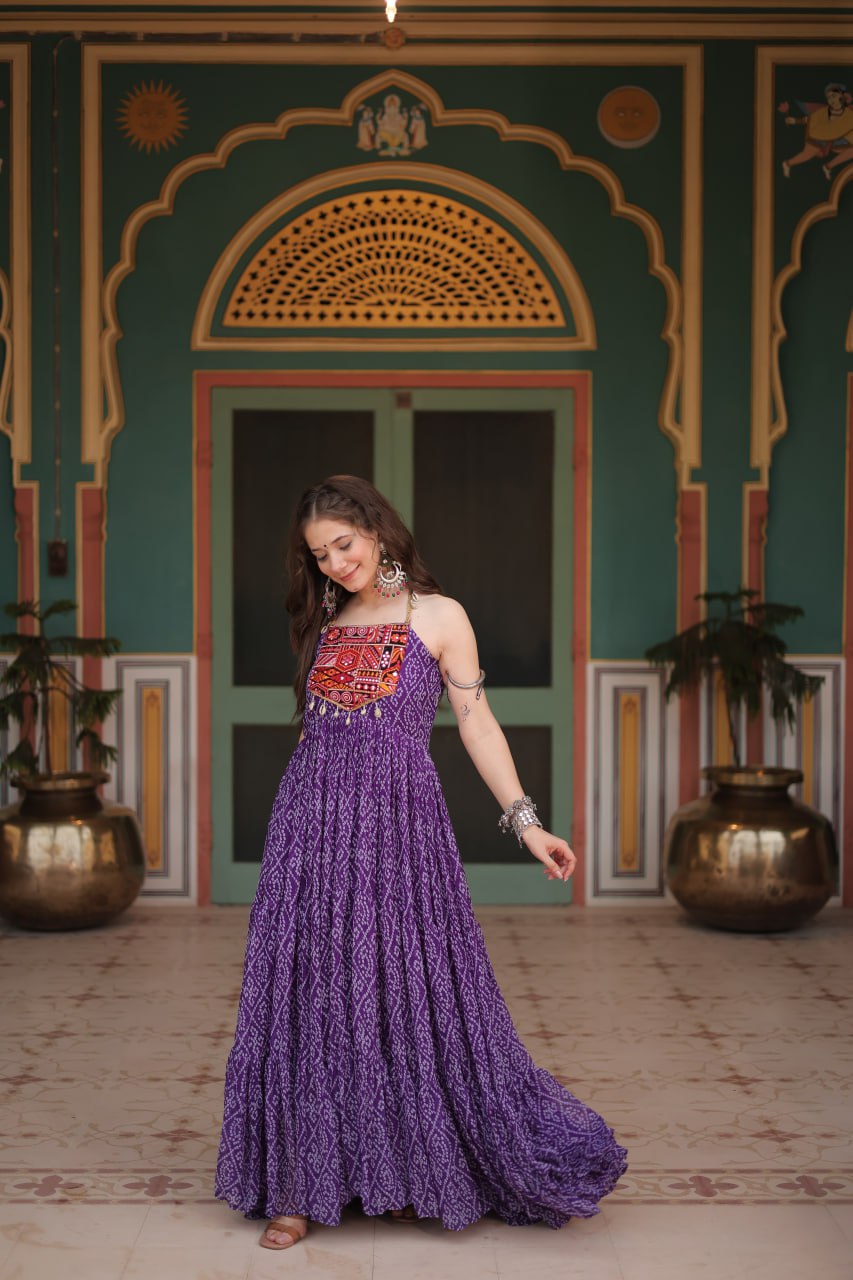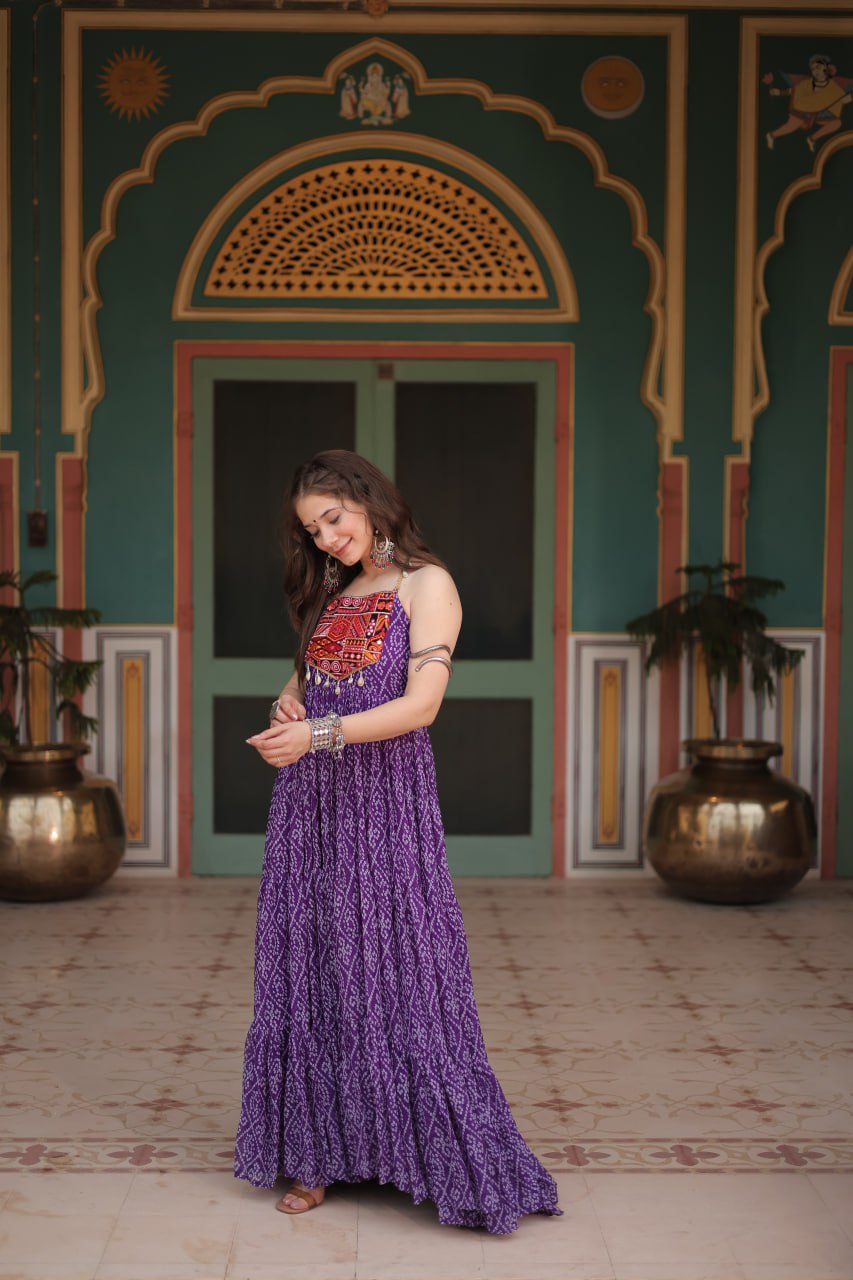 Prepare to shine this Navratri in a Black, Red and purple bandhani printed georgette gown, enhanced with elegant Kutchi patchwork that elevates the traditional design. This sleeveless gown, sized L with a 40-inch stitched bust, comfortably fits sizes 38 to 44 inches. Its 56-inch length and flared skirt, crafted from 12 meters of fabric, create a flowing, graceful silhouette. Made from breathable georgette and lined with soft cotton, it offers both style and comfort. The detailed bandhani print ensures you make a striking impression at any festival event. Note: Slight color variations may occur due to photography.
