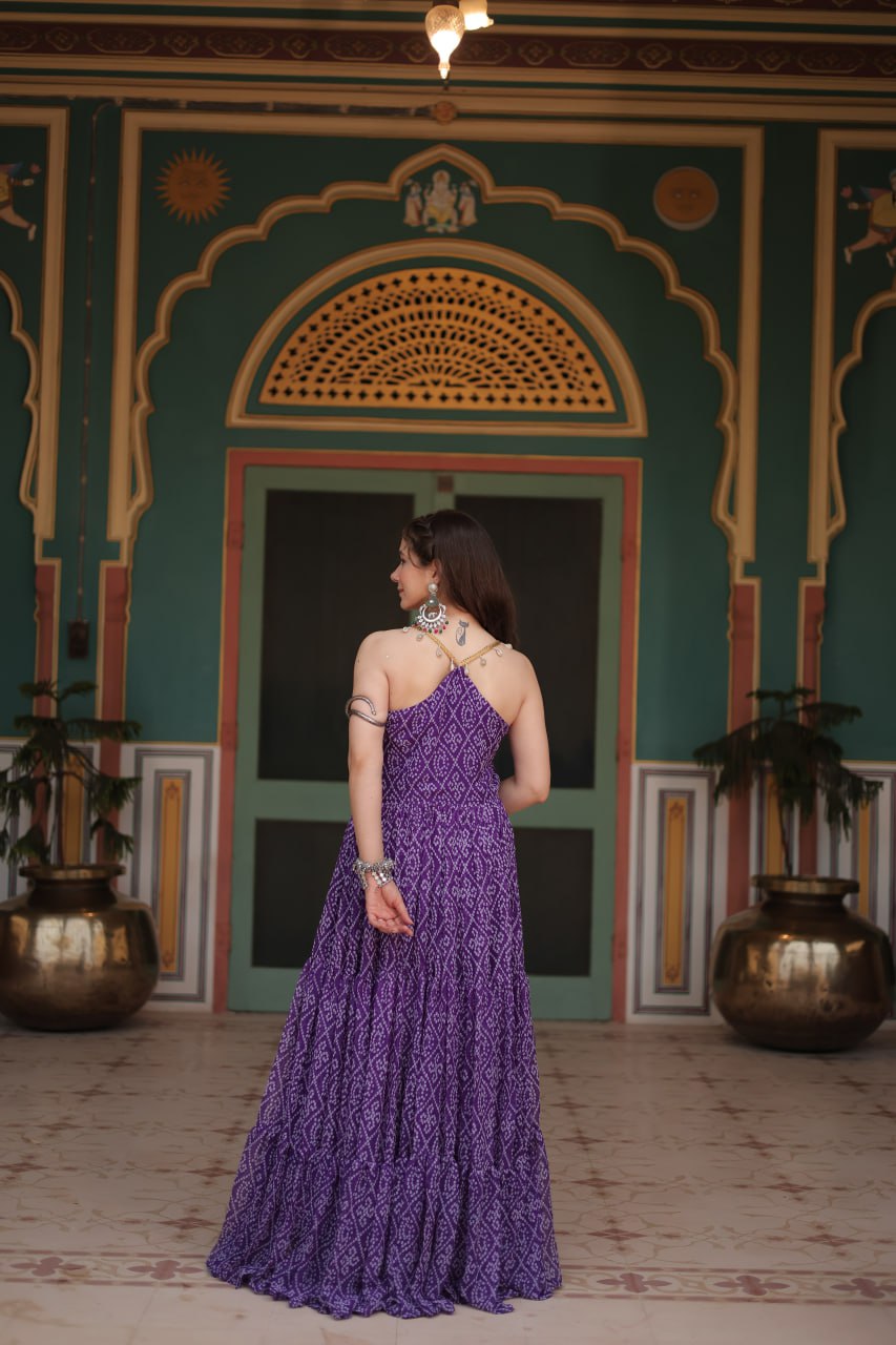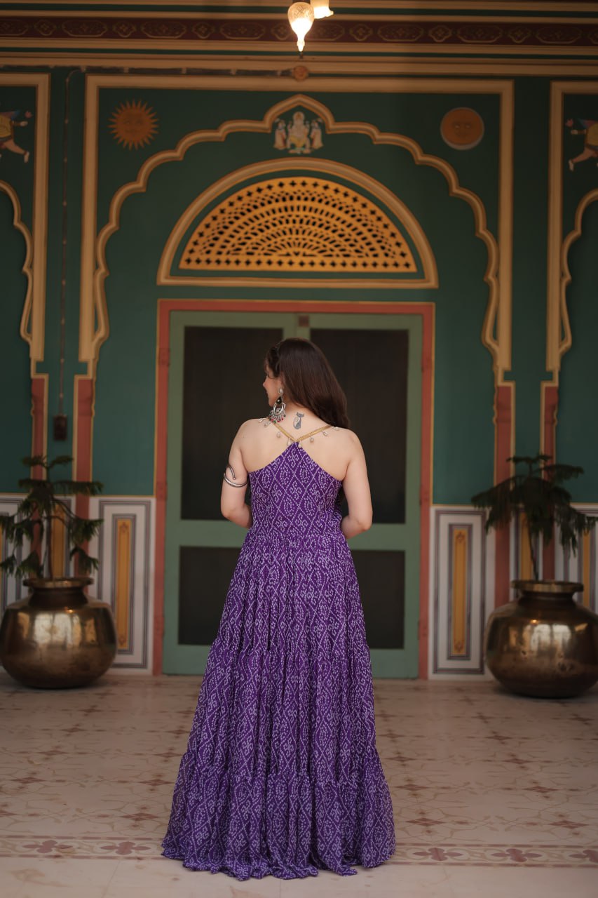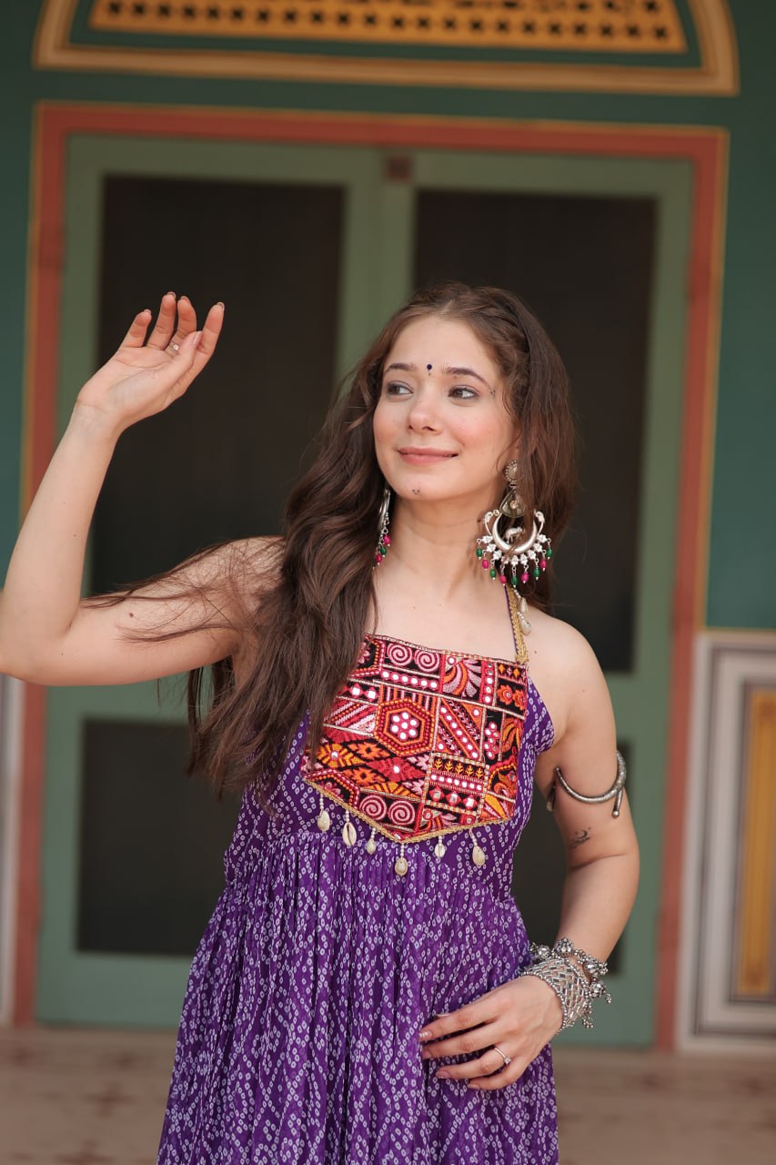 Prepare to shine this Navratri in a Black, Red and purple bandhani printed georgette gown, enhanced with elegant Kutchi patchwork that elevates the traditional design. This sleeveless gown, sized L with a 40-inch stitched bust, comfortably fits sizes 38 to 44 inches. Its 56-inch length and flared skirt, crafted from 12 meters of fabric, create a flowing, graceful silhouette. Made from breathable georgette and lined with soft cotton, it offers both style and comfort. The detailed bandhani print ensures you make a striking impression at any festival event. Note: Slight color variations may occur due to photography.