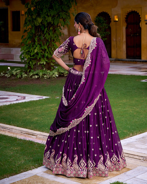 Showcase timeless festive charm with this purple rangoli crush lehenga choli, exquisitely detailed with intricate embroidery. Accompanied by an unstitched blouse, it allows for a tailored fit, making it an ideal choice for weddings and Navratri festivities.