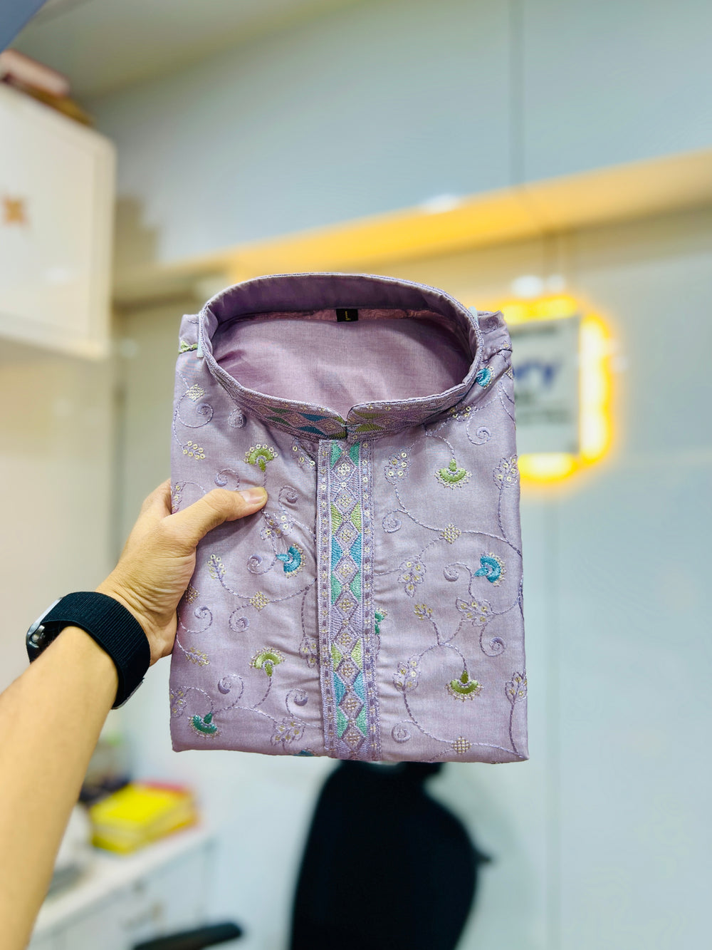 Elevate your wedding attire with our Purple Mens Kurta Pajama, featuring intricate Multi Embroidery Flower Work on lustrous Silky Silk fabric. Complete the traditional look with the comfortable Cotton Pajama. Available in sizes M-3XL. Quality guaranteed with 100% Export Quality Products. Slight color variations may occur due to digital photography.