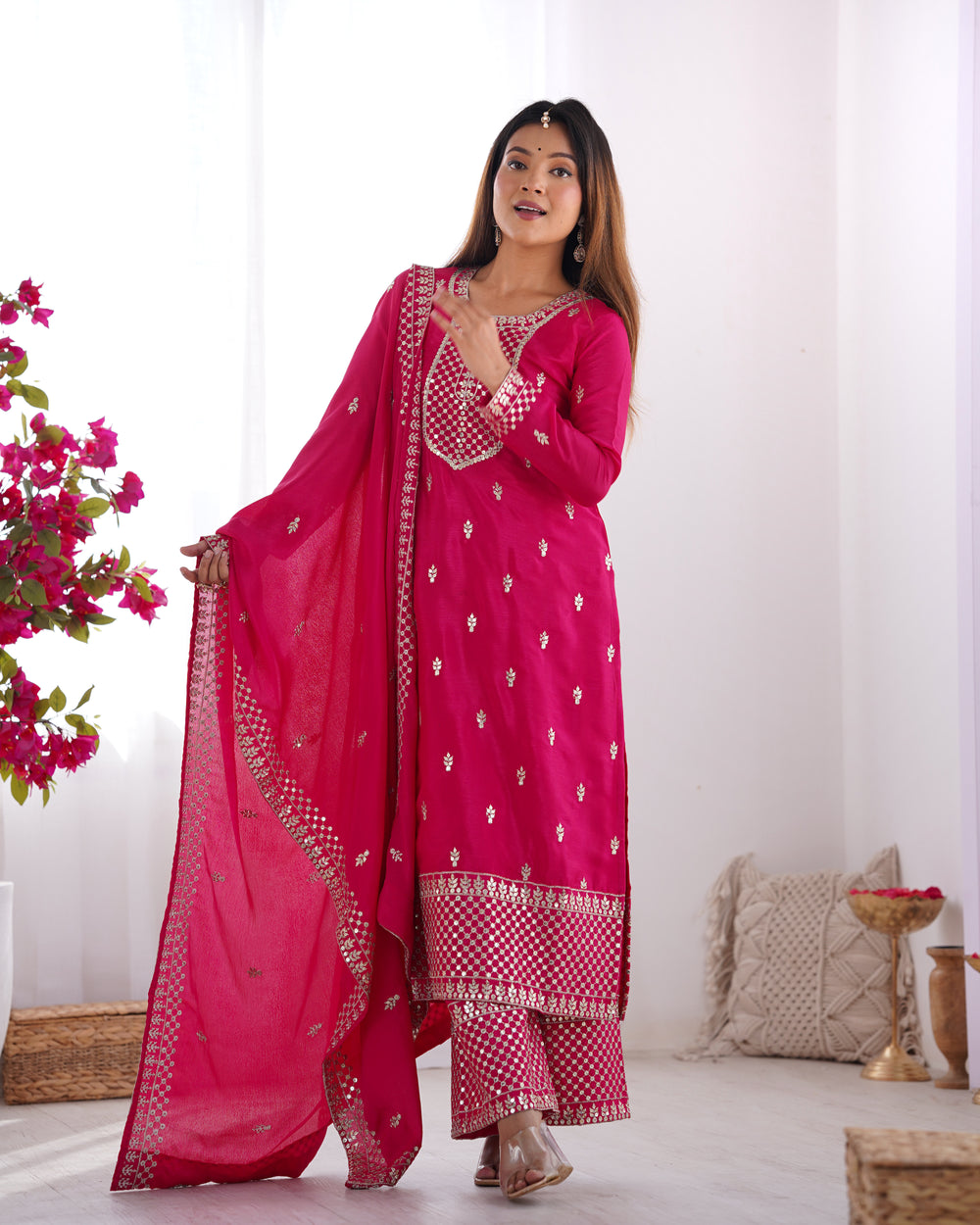 Elevate your festive wardrobe with this rani pink three-piece kurti suit made from premium chinon silk. The luxurious fabric offers a smooth, elegant drape, while the vibrant rani pink hue adds a striking touch of sophistication. Designed for comfort and style, this ensemble is ideal for celebrations, ensuring you stand out with grace and charm.