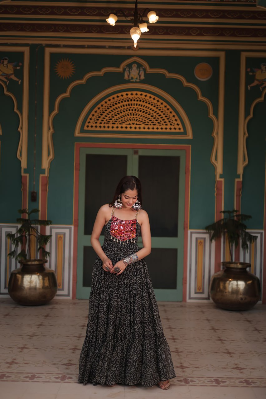 Prepare to shine this Navratri in a Black bandhani printed georgette gown, enhanced with elegant Kutchi patchwork that elevates the traditional design. This sleeveless gown, sized L with a 40-inch stitched bust, comfortably fits sizes 38 to 44 inches. Its 56-inch length and flared skirt, crafted from 12 meters of fabric, create a flowing, graceful silhouette. Made from breathable georgette and lined with soft cotton, it offers both style and comfort. The detailed bandhani print ensures you make a striking impression at any festival event. Note: Slight color variations may occur due to photography.