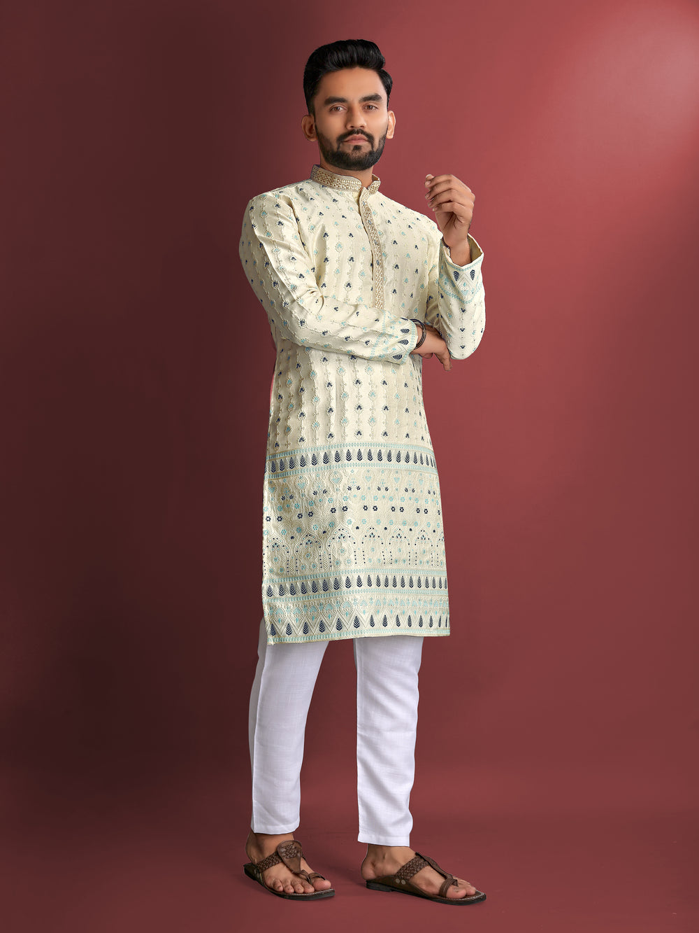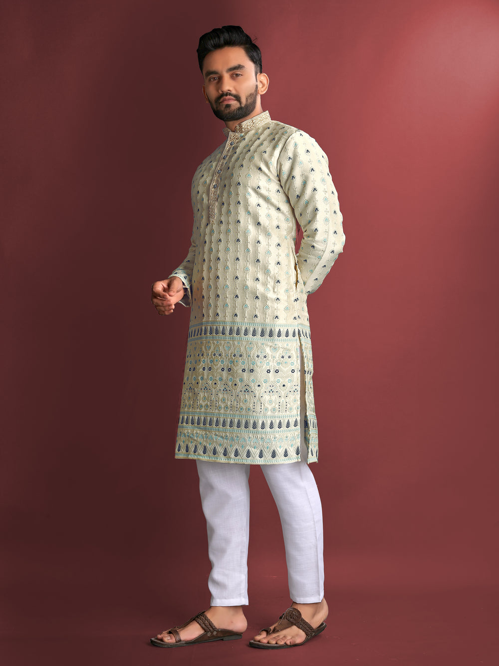 OFF WHITE WEDDING MENS KURTA PAJAMA IN JACQUARD WITH HEAVY EMBOSSED WORK