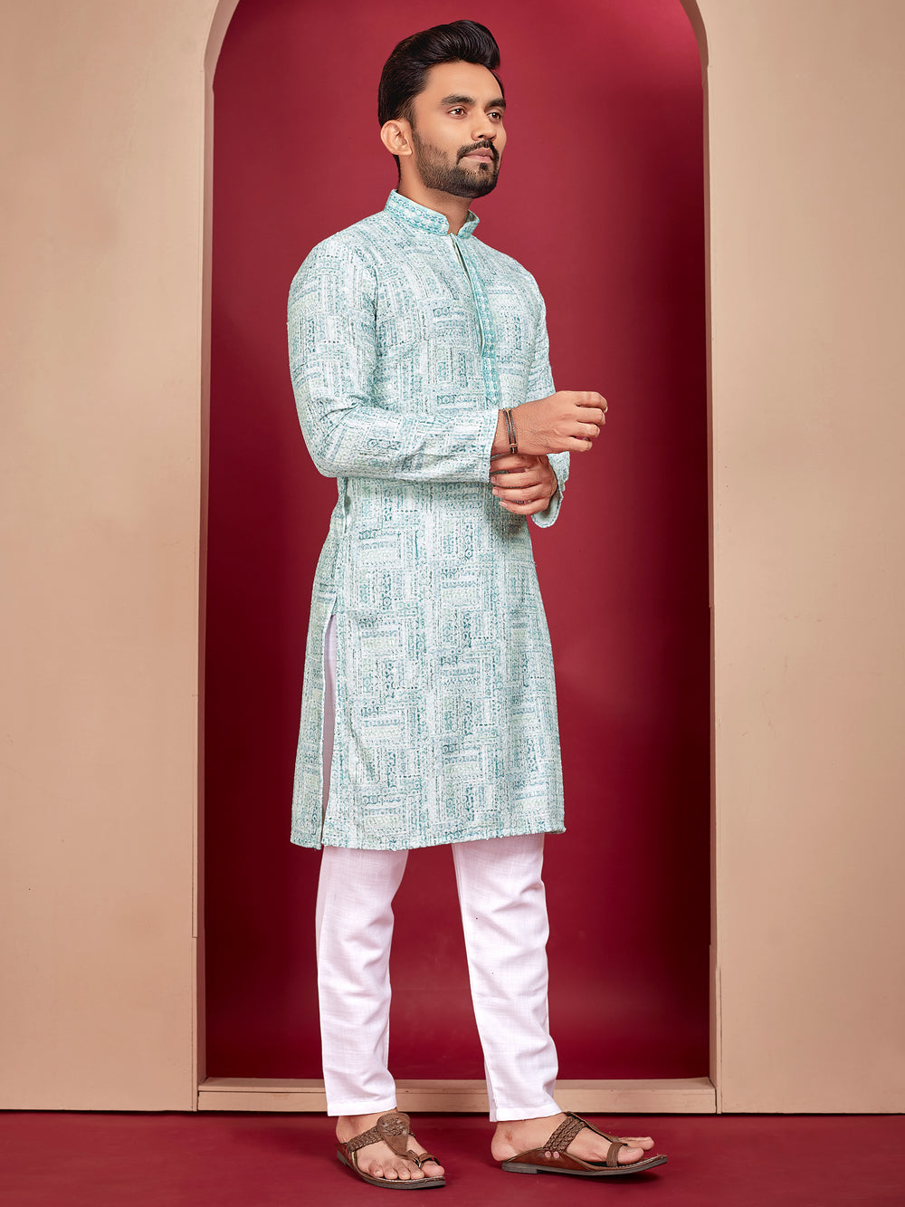 Explore the allure of our sky kurta set thoughtfully designed for Haldi and Sangeet celebrations.