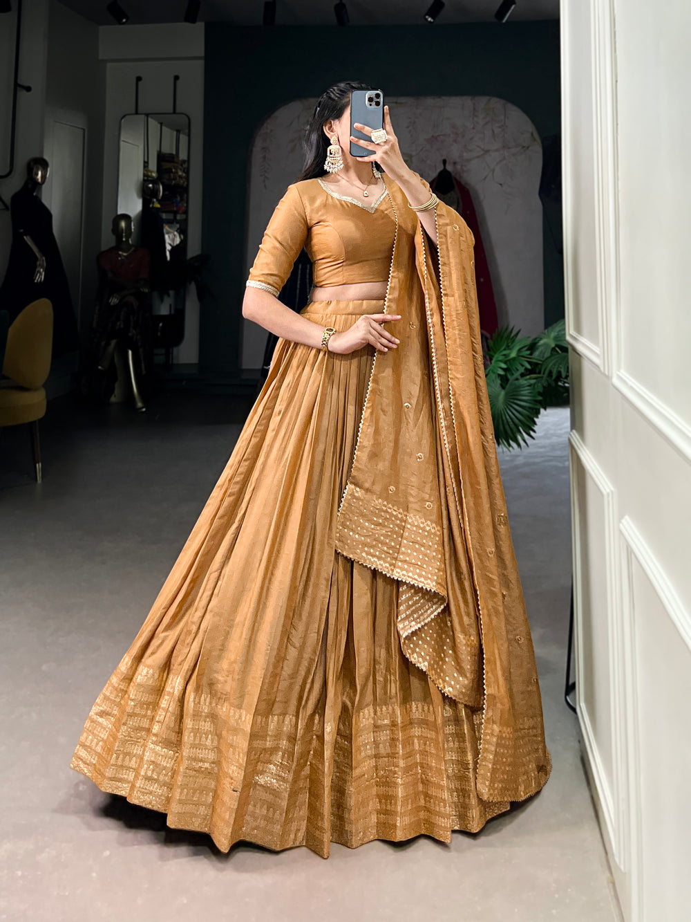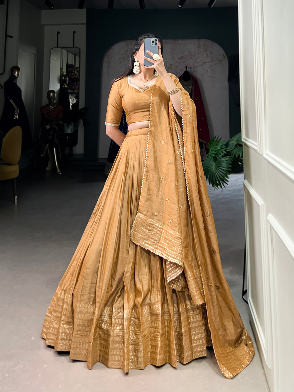 Elevate your festive wardrobe with this Stunning Mustard Yellow Chanderi Lehenga Choli, crafted from premium Chanderi fabric known for its lightweight and breathable qualities. The intricate zari work adds a touch of traditional elegance, while the coordinating dupatta completes the ensemble with grace. Perfectly suited for Navratri and other special occasions, this lehenga choli balances timeless craftsmanship with comfortable wearability.