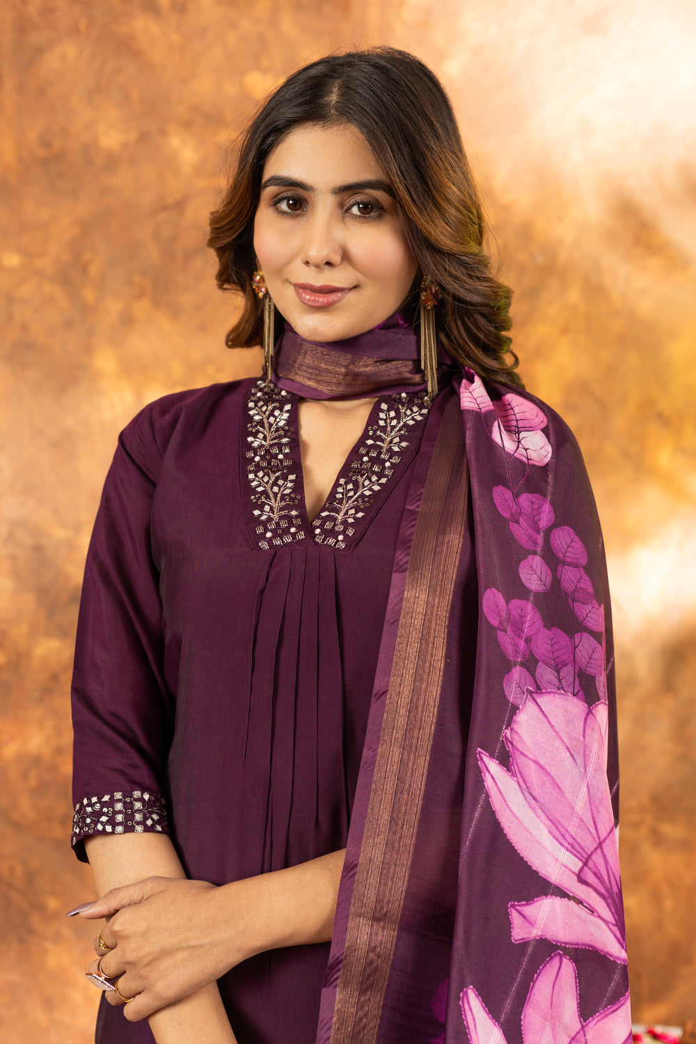 Make a striking and elegant impression with this purple embroidered kurta and pant set, paired with a flowing floral dupatta. Crafted for festive occasions and special events, it blends deep hues with detailed embroidery for a sophisticated ethnic appearance. Featuring three-quarter sleeves, fine mirror and thread work, and a comfortable silhouette, it suits both daytime and evening functions. Pair it with jhumkas and heels to perfect your festive look. Ideal for Diwali, weddings, pujas, and parties, this ensemble guarantees you stand out with grace.