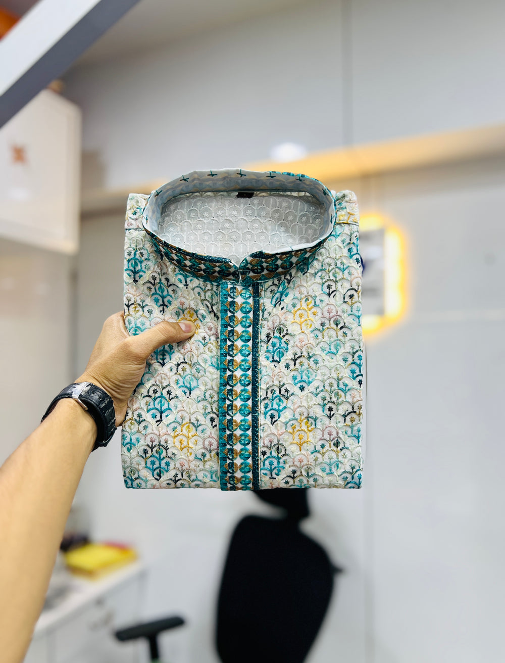 TEAL WEDDING MENS KURTA PAJAMA IN RAYON WITH HEAVY LUCKNOWI AND PRINTED WORK