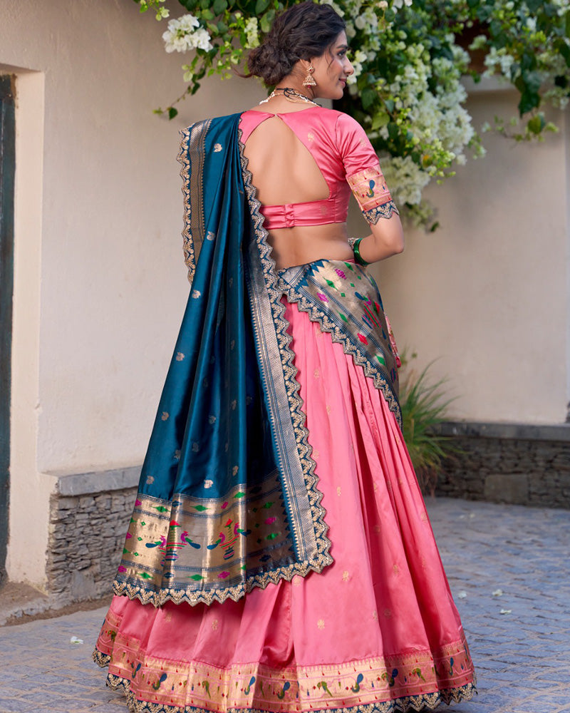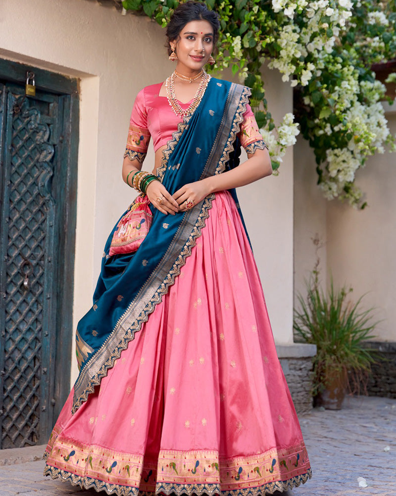 Elevate your festive wardrobe with this Traditional Paithani Jacquard Silk Half Saree Lehenga Set, expertly crafted for weddings and special occasions. Made from premium jacquard silk, the lehenga showcases intricate Paithani patterns that reflect timeless artistry. Complemented by a matching choli and dupatta, this ensemble offers a sophisticated blend of tradition and elegance, ensuring a graceful and distinguished appearance at any celebration.