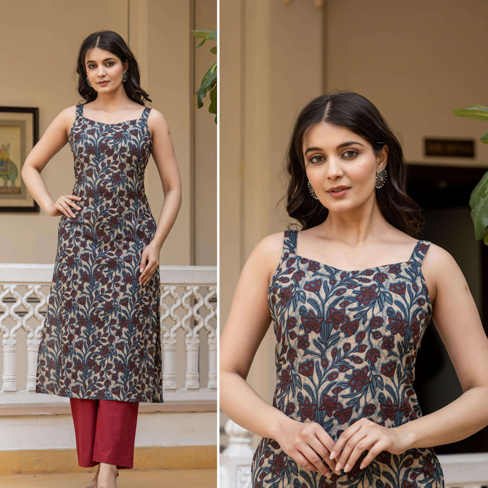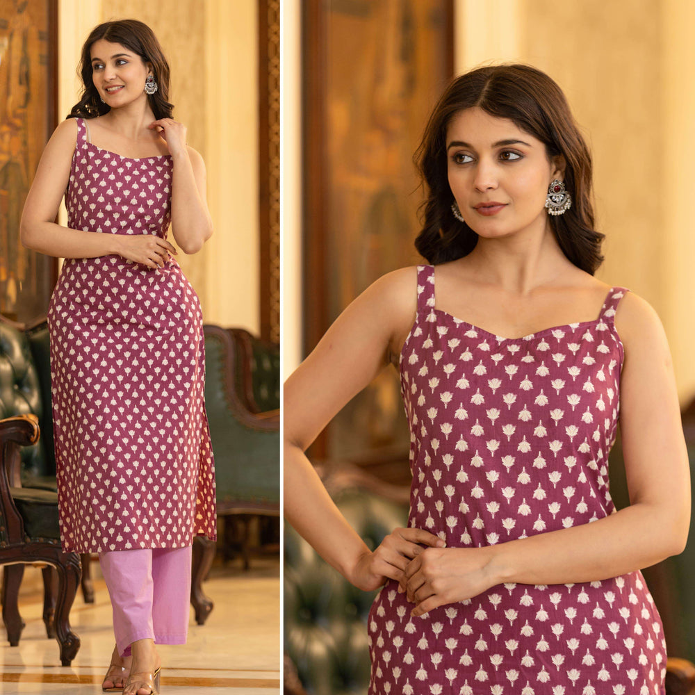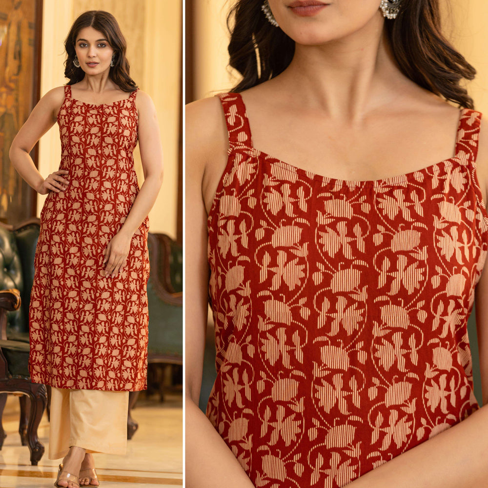 This sleeveless cotton kurti, featuring a printed design, is ideal for both everyday and office wear.