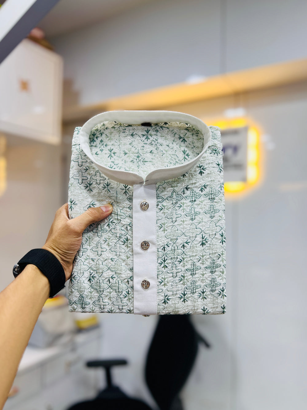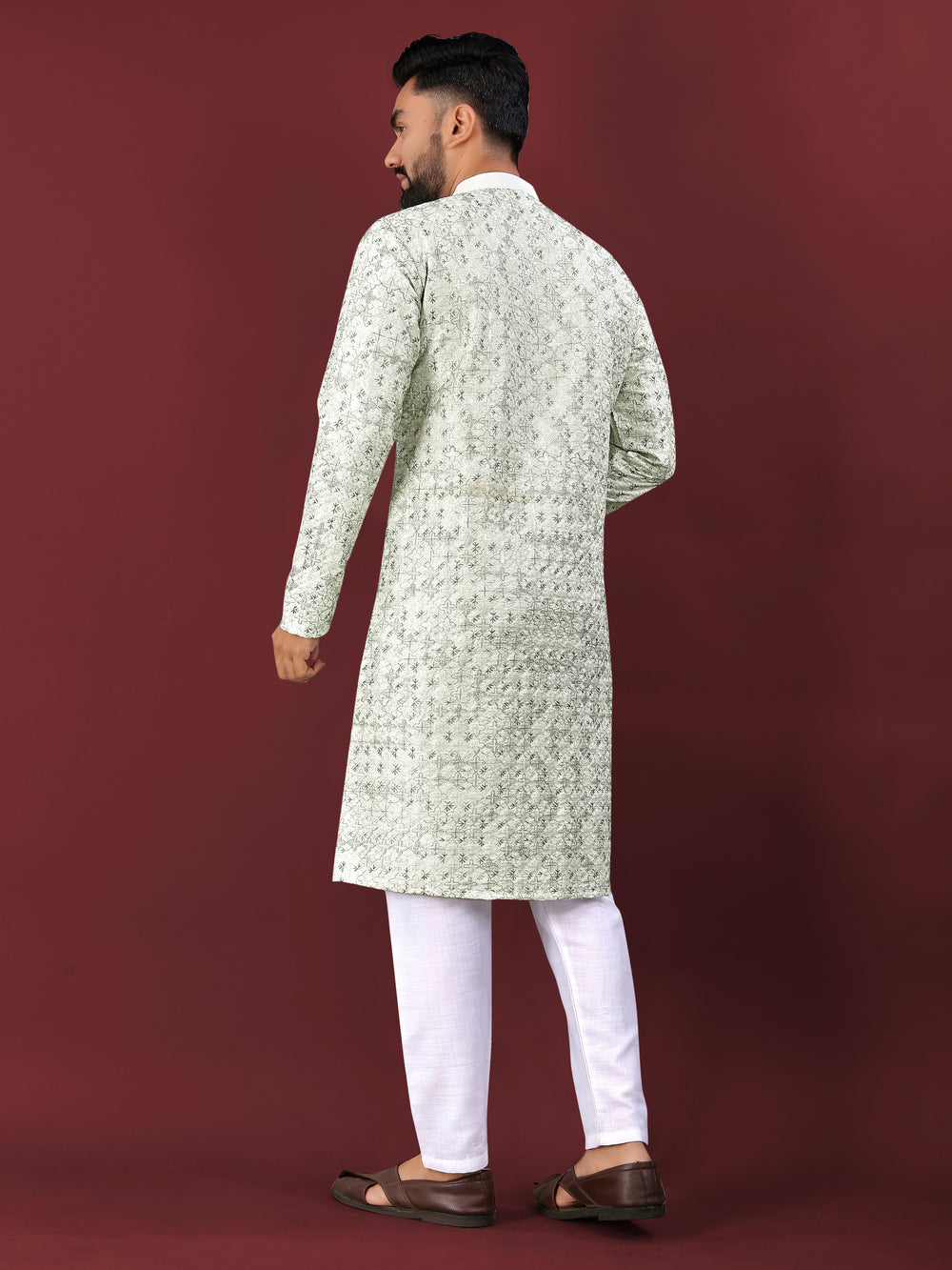 White Wedding Kurta Pajama for Men With Green Thread Lucknowi and Sequence Work