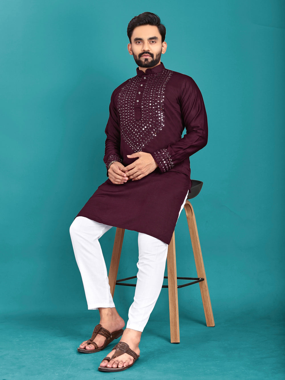 Expertly designed for traditional occasions and weddings, this kurta pajama set from MITVAL💎 is a true gem. Made from premium soft silk, the kurta features handcrafted real mirror work on the neck and sleeves for a touch of elegance. The mandarin collar and regular fit add to the overall sophisticated look. Available in multiple sizes and weights, get yours now before they're gone!