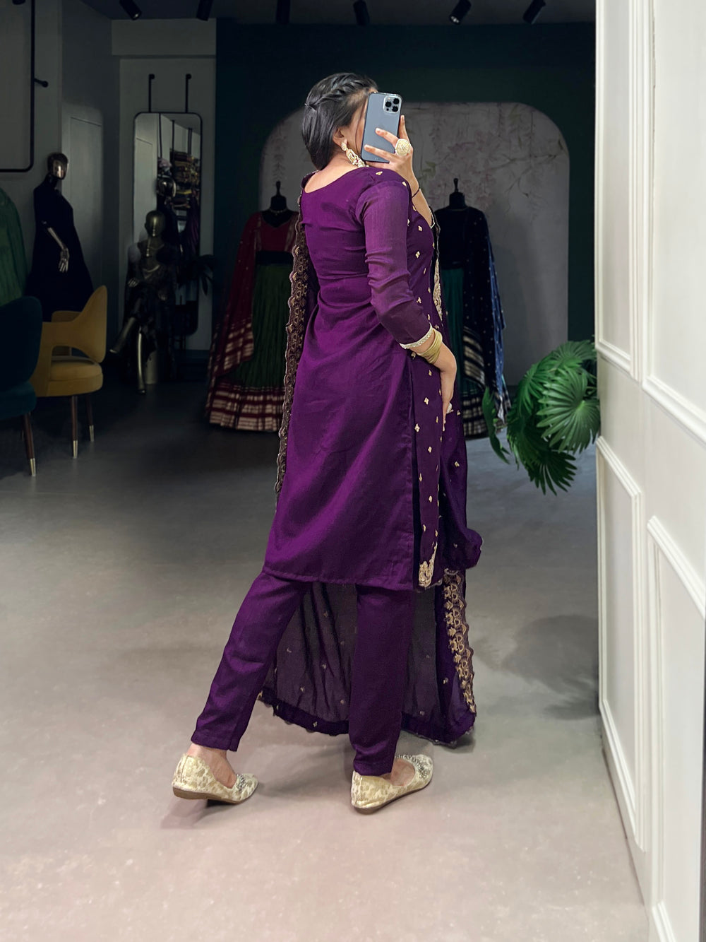 Step into elegance with this beautifully crafted stitched Vichitra silk suit set, perfect for festive occasions and traditional celebrations. The top features luxurious Vichitra silk fabric adorned with delicate sequins and thread embroidery, enhanced with a subtle lace touch-up for added charm. It comes lined with soft micro cotton for maximum comfort. Paired with a plain yet graceful Vichitra silk bottom with an elasticated waist, the set ensures ease of wear without compromising style. Completing the look is a matching embroidered Vichitra silk dupatta, making this ensemble a timeless addition to your ethnic collection.
