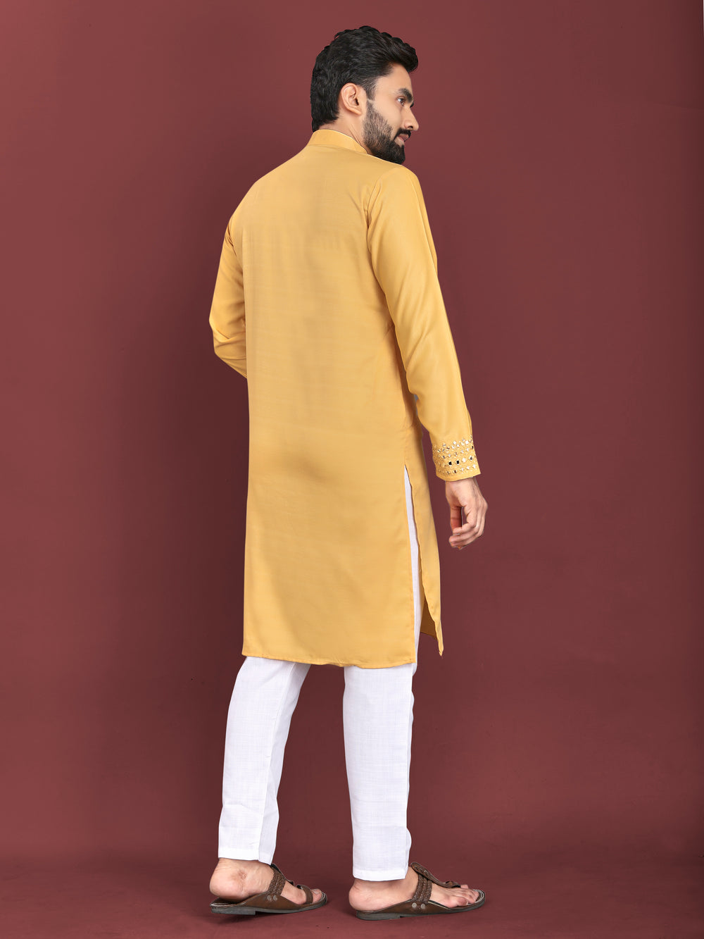 YELLOW COLOR MEN'S KURTA PAJAMA SET IN SOFT SILK WITH REAL MIRROR WORK ON NECK