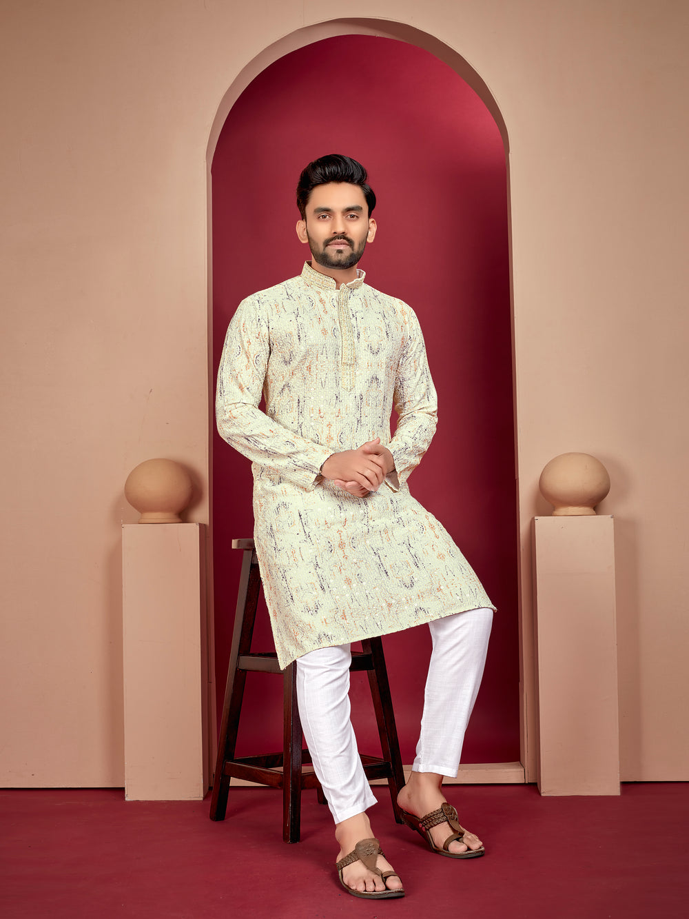 YELLOW WEDDING MENS KURTA PAJAMA IN RAYON WITH HEAVY LUCKNOWI AND PRINTED WORK
