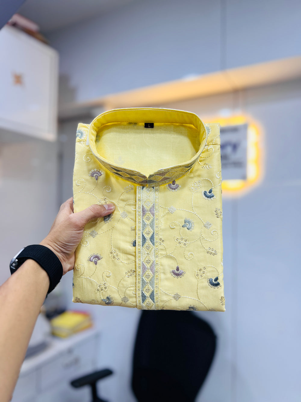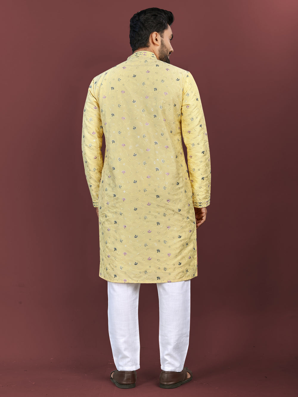 Elevate your wedding attire with our Yellow Mens Kurta Pajama, featuring intricate Multi Embroidery Flower Work on lustrous Silky Silk fabric. Complete the traditional look with the comfortable Cotton Pajama. Available in sizes M-3XL. Quality guaranteed with 100% Export Quality Products. Slight color variations may occur due to digital photography.